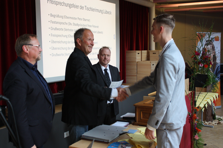 Der stellvertretende Stadtpräsident Petereit überbrachte die Glückwünsche der Hansestadt Lübeck und zeigte sich erstaunt über die handwerklichen Fähigkeiten,  die alle Junggesell:innen mit ihren Gesellenstücken bewiesen hatten. Die Stadt braucht die jungen Tischlergesell:innen. Petereit erinnert an die zahlreichen Aufstiegs- und Spezialisierungsmöglichkeiten. Wer seine Meisterausbildung mit Erfolg abschließt, habe gute Chancen in Zukunft einen Betrieb zu übernehmen. Tischler seien, nach seinen Worten, vor allem Allrounder. Der digitale Wandel habe auch den Tischlerberuf erreicht. Holzverarbeitung biete in diesem Bereich in Zukunft ungeahnte Möglichkeiten.