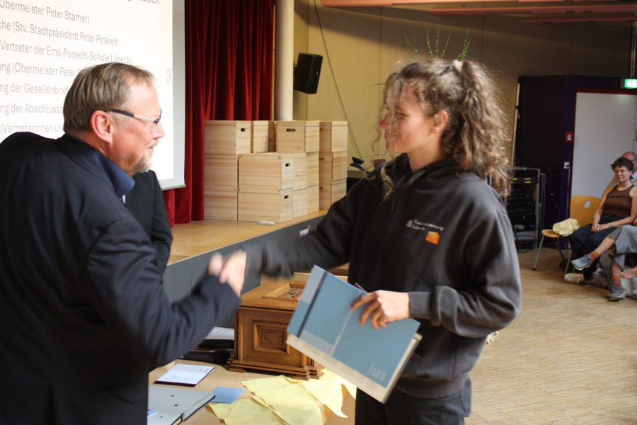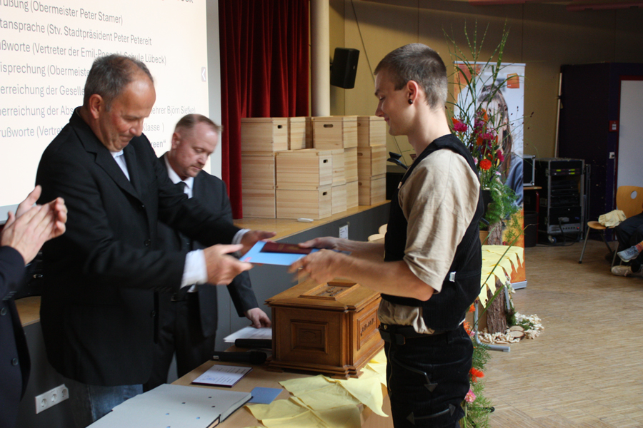 Obermeister Peter Stamer spricht Lübecker Tischlerauszubildende frei