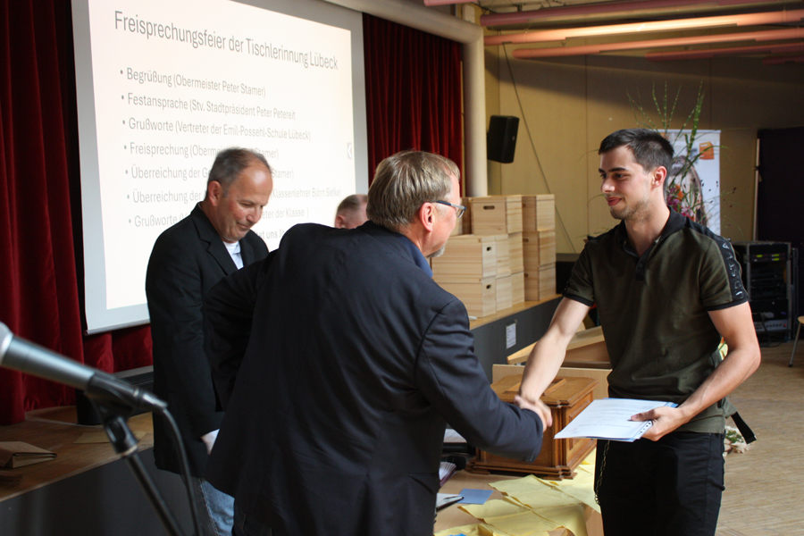 Obermeister Peter Stamer spricht Lübecker Tischlerauszubildende frei